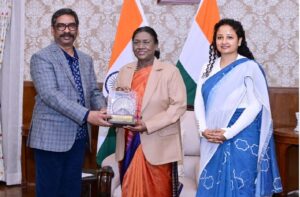 Ranchi : झारखंड के मुख्यमंत्री हेमंत सोरेन और विधायक कल्पना सोरेन मुर्मू ने मंगलवार सुबह लोकभवन में राष्ट्रपति द्रौपदी मुर्मू से शिष्टाचार भेंट की. यह मुलाकात औपचारिक एवं सौहार्दपूर्ण वातावरण में हुई.