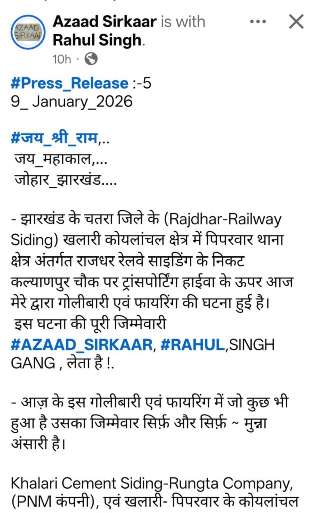 प्रेस विज्ञप्ति में यह भी कहा गया है कि पिपरवार के कोयलांचल क्षेत्र में विभिन्न रेलवे साइडिंग पर काम करने वाले लोगों के लिए यह “अंतिम चेतावनी” है। गिरोह ने धमकी भरे लहजे में कहा है कि पहले की तरह “मैनेज” करके काम किया जाए, अन्यथा अगली बार किसी को भी बख्शा नहीं जाएगा।