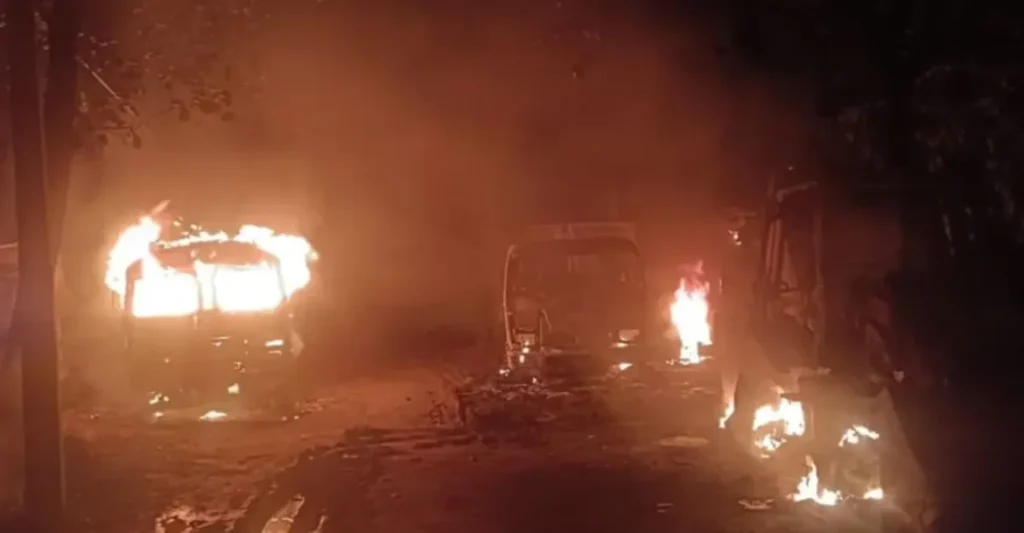 प्राप्त जानकारी के अनुसार, अज्ञात अपराधियों ने सोमवार रात करीब एक बजे निर्माण स्थल पर धावा बोला। उस समय वहां मौजूद मजदूर और मुंशी जान बचाकर भागे। हमलावरों ने मौके पर खड़ी दो जेसीबी मशीन, दो डंपर, एक ग्रेडर, एक पानी टैंकर और एक जनरेटर को आग के हवाले कर दिया।