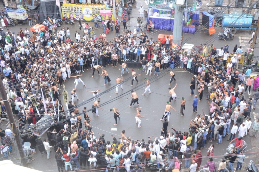 शहर के अलग-अलग अखाड़ों ने पारंपरिक शैलियों में लाठी और तलवारों से हैरतअंगेज प्रदर्शन किए। धौताल अखाड़ा के खलीफा जमशेद अली उर्फ पप्पू गद्दी, इमाम बख्श अखाड़ा के खलीफा मो मौजूद, शमश नौजवान कमिटी, लीलू अली अखाड़ा और मोरहाबादी स्थित मुहर्रम नौजवान कमिटी के नेतृत्व में विभिन्न दलों ने अपने-अपने करतबों से दर्शकों को मंत्रमुग्ध कर दिया।