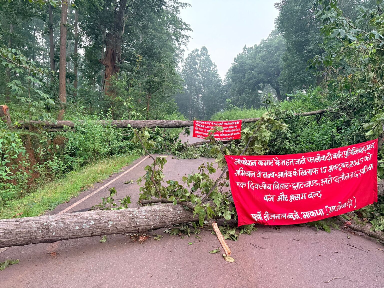 नक्सलियों ने मनोहरपुर-कोलबोंगा मुख्य सड़क को पूरी तरह अवरुद्ध कर दिया है। उन्होंने सड़क के बीचों-बीच बड़े-बड़े पेड़ काटकर गिरा दिए, जिससे आवागमन पूरी तरह ठप हो गया है।