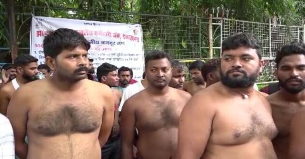 Ranchi: झारखंड में 108 एंबुलेंस सेवा से जुड़े कर्मियों ने मंगलवार को राजभवन के बाहर नंग-धड़ंग प्रदर्शन कर सरकार के खिलाफ जोरदार विरोध जताया। प्रदर्शनकारी कर्मियों ने स्थायी बहाली, उचित मानदेय और सरकारी कर्मचारियों जैसी सुविधाएं देने की मांग रखी।